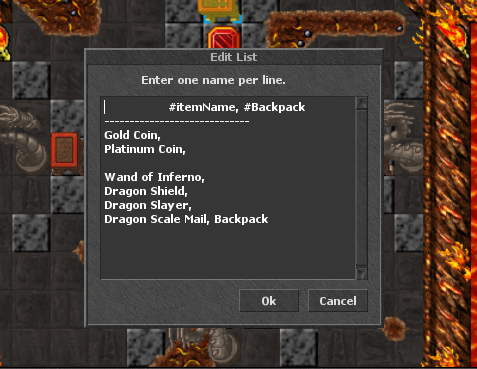 → IMPORTANTE:: Se você quer que o item seja recolhido direto para sua backpack principal -> "royal helmet," COM A VÍRGULA NO FINAL E SEM O BACKPACK.